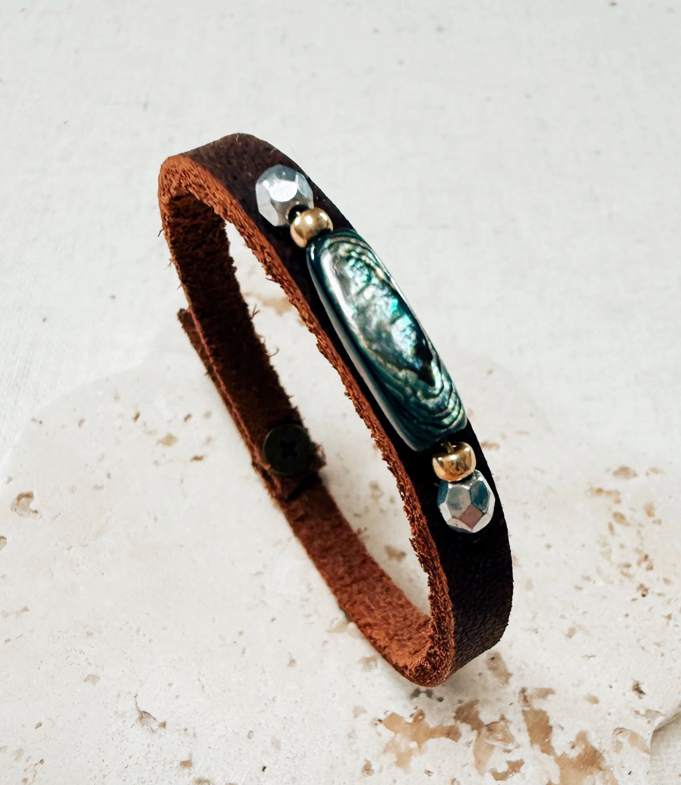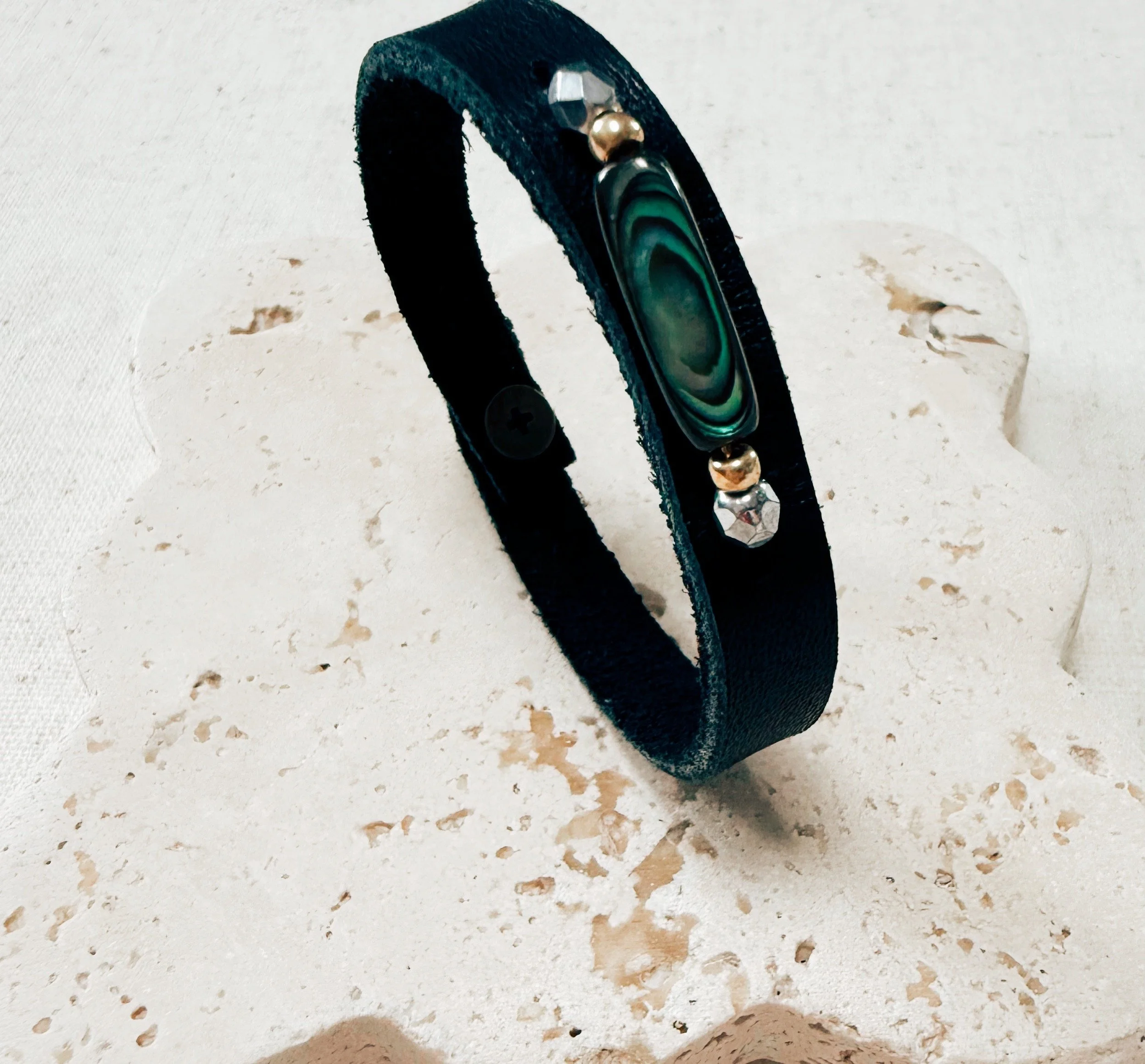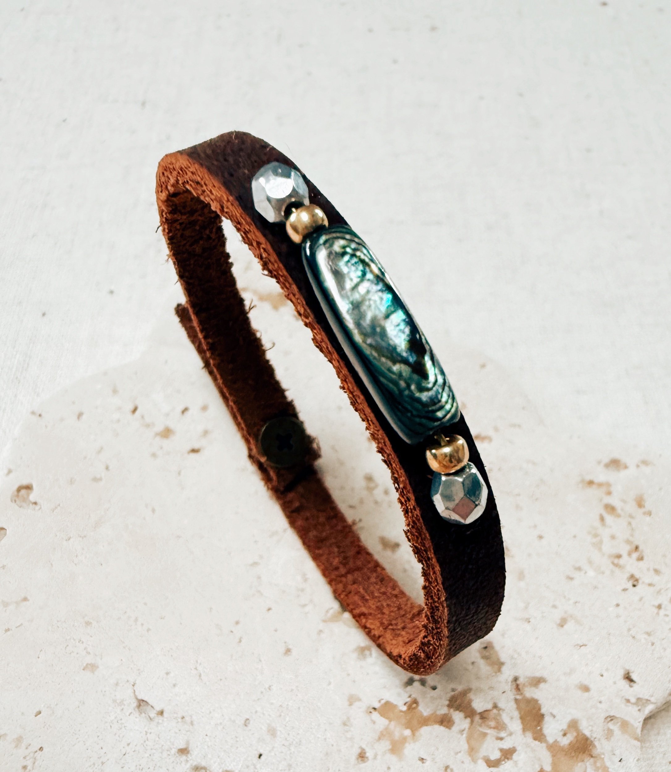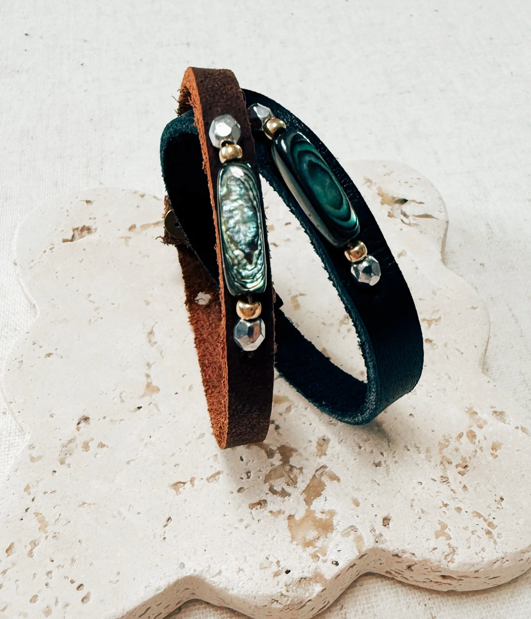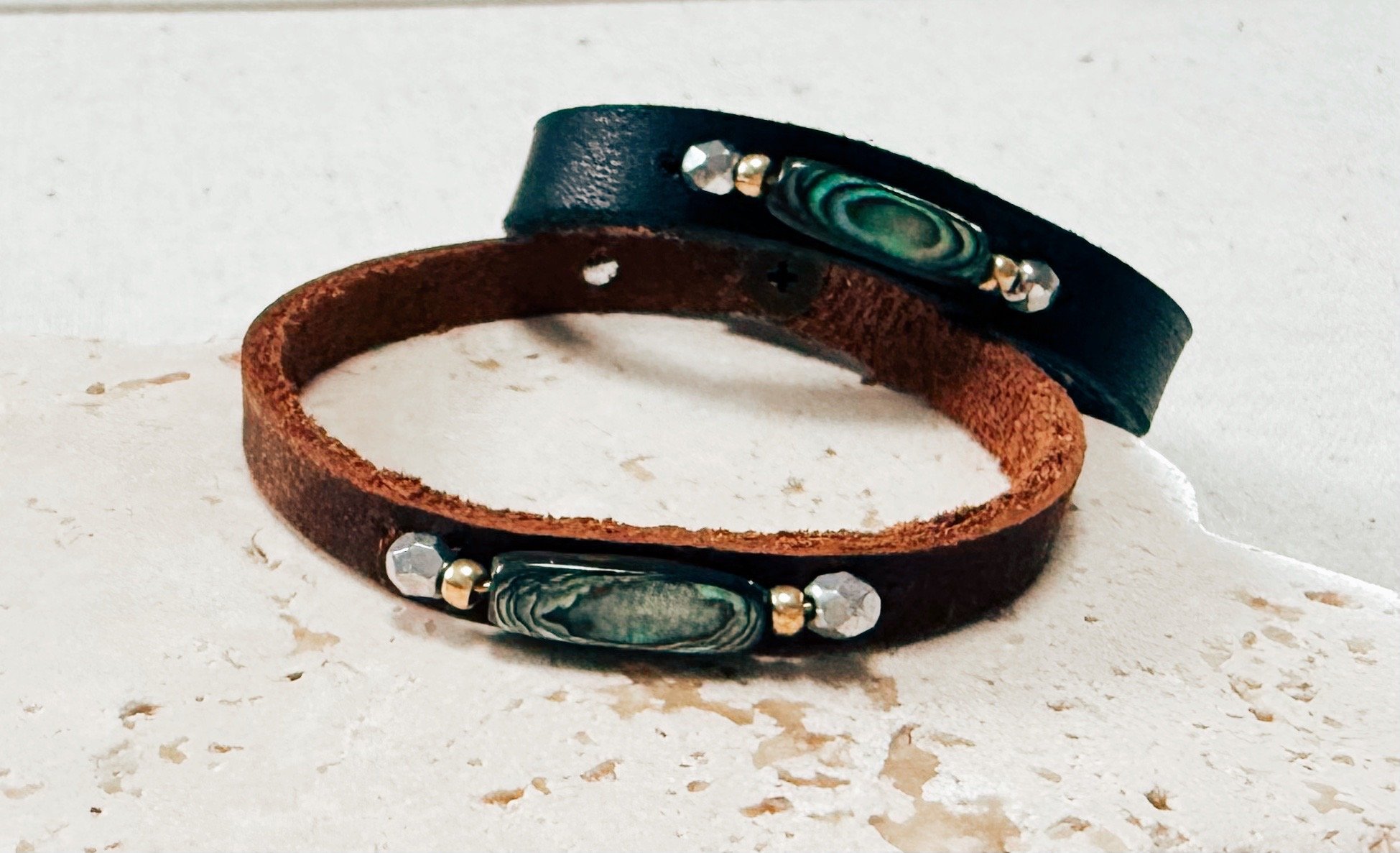 This cuff is so comfortable you’ll forget you’re wearing a bracelet! It comes in 2 colors a soft black or brown. The middle of the cuff has a delicate polished piece of abalone, with dainty gold and silver beads accented on both sides. It measures 7in and adjusts to 2 sizes. Each piece of abalone has a different shimmer to it, making each cuff unique for you!