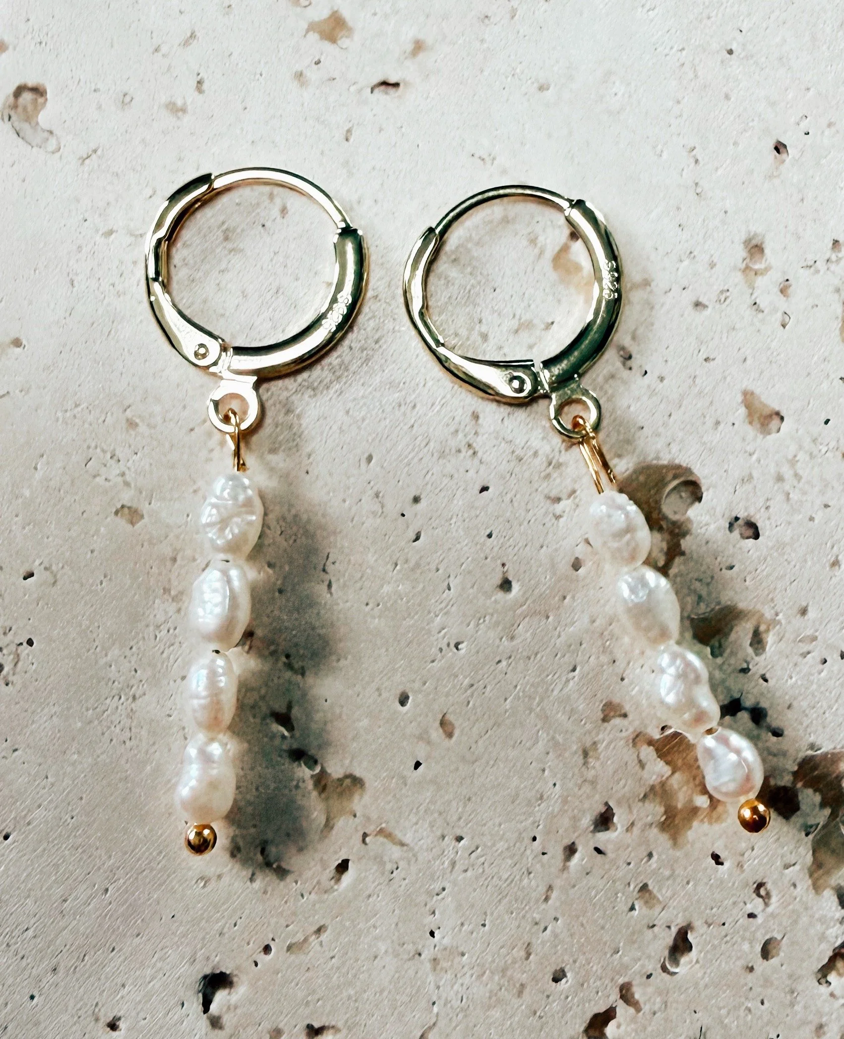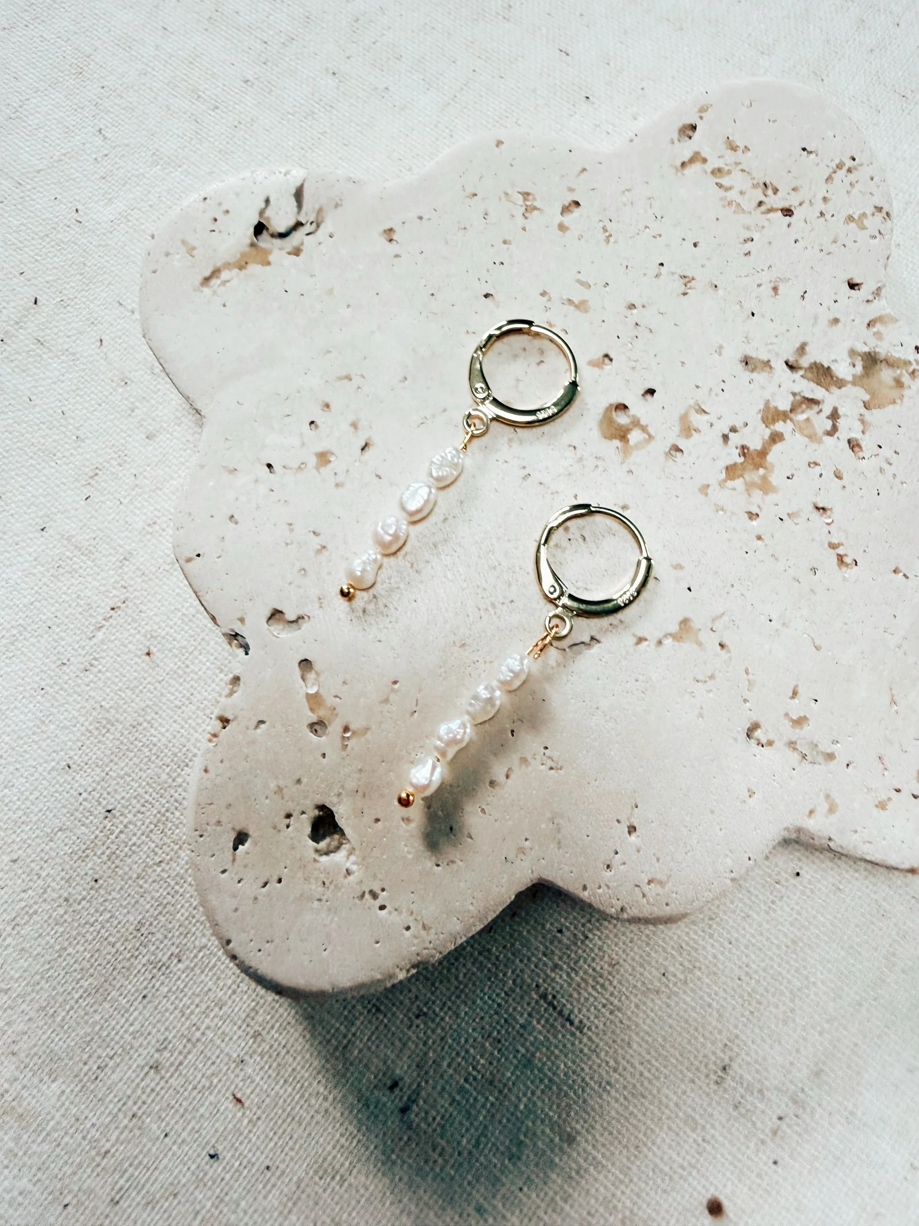 Features delicate freshwater rice pearls are accented with some gold fill and a delicate gold fill huggie hoop! Available in Silver plated as well.
