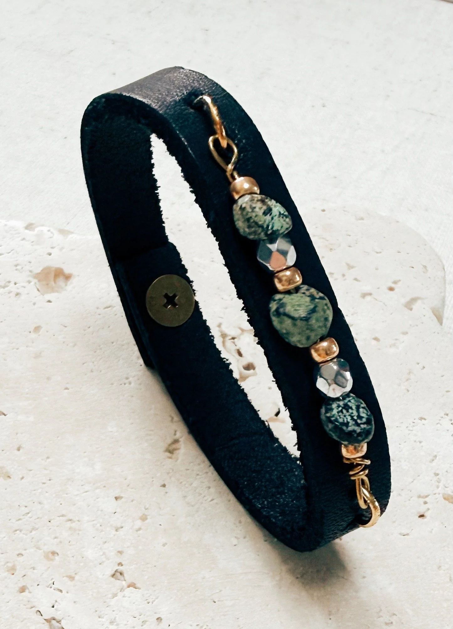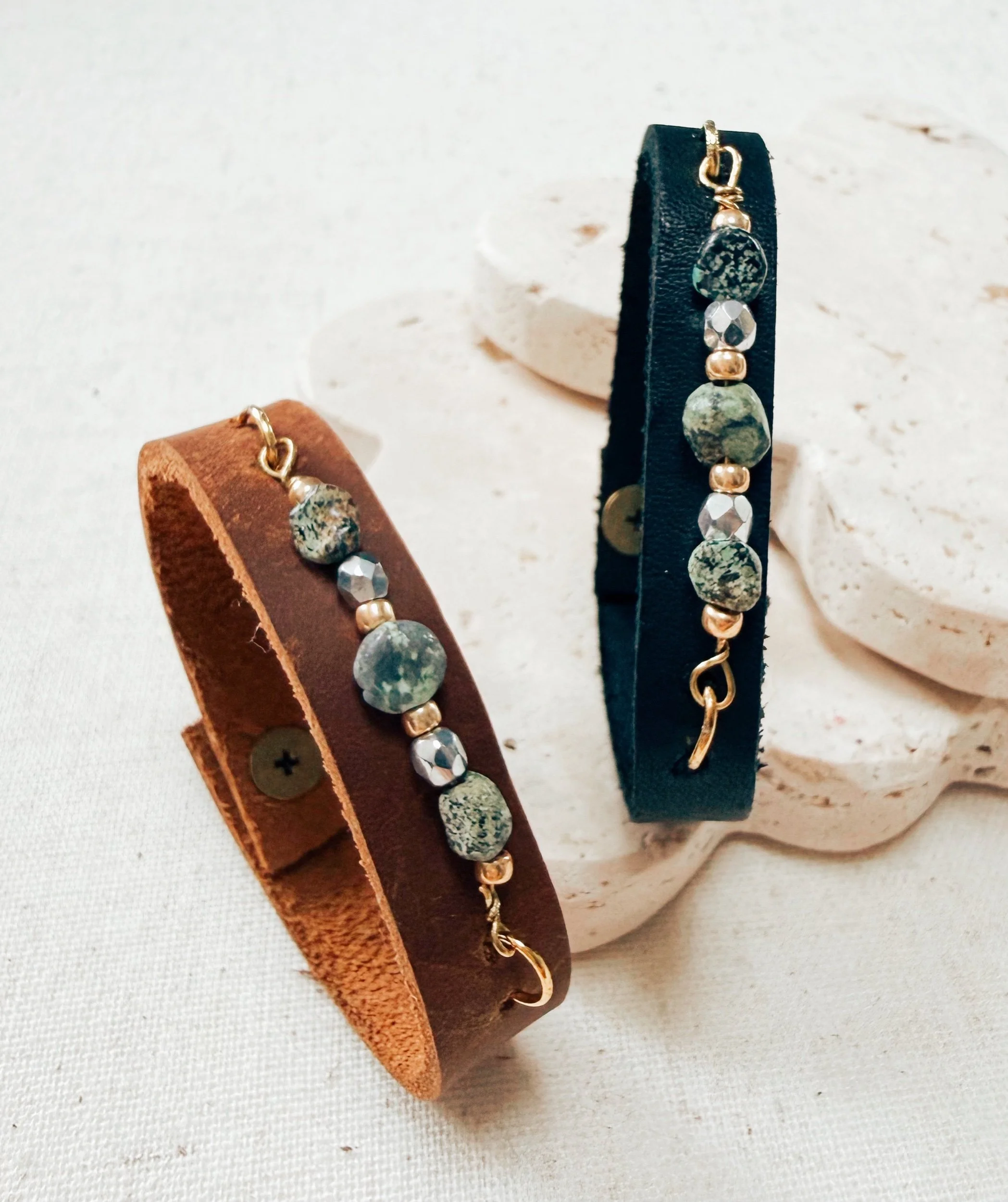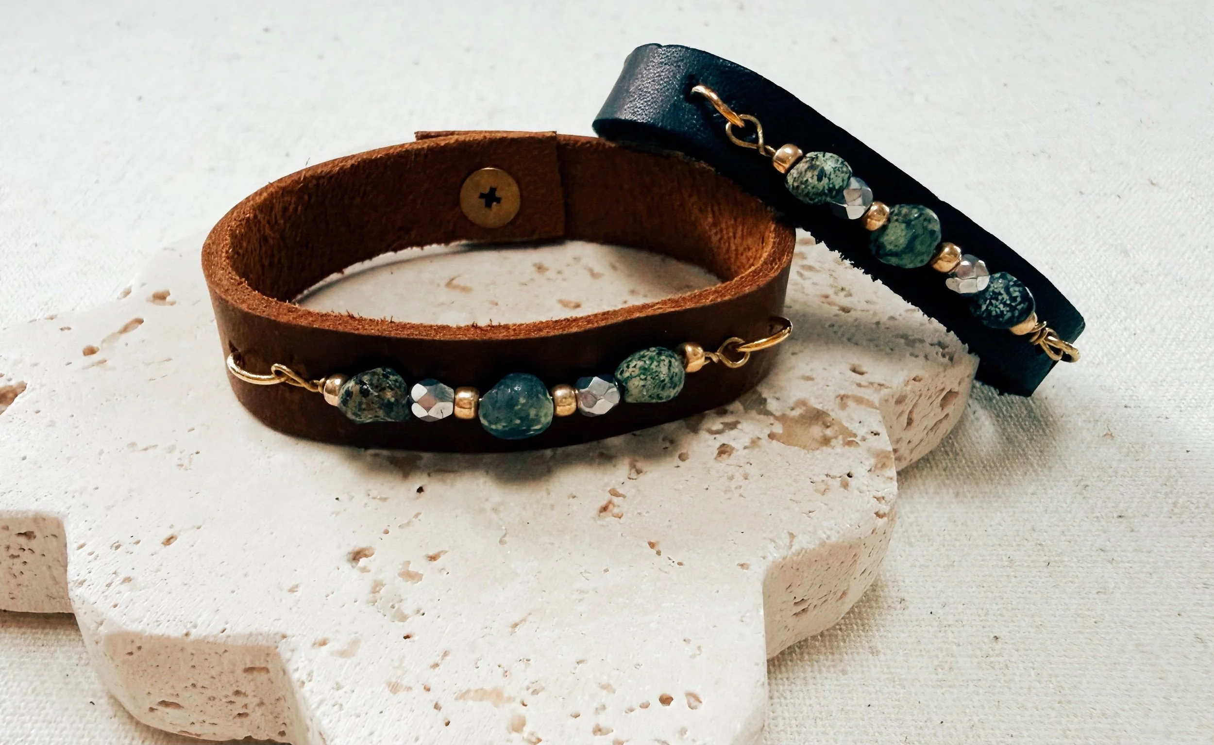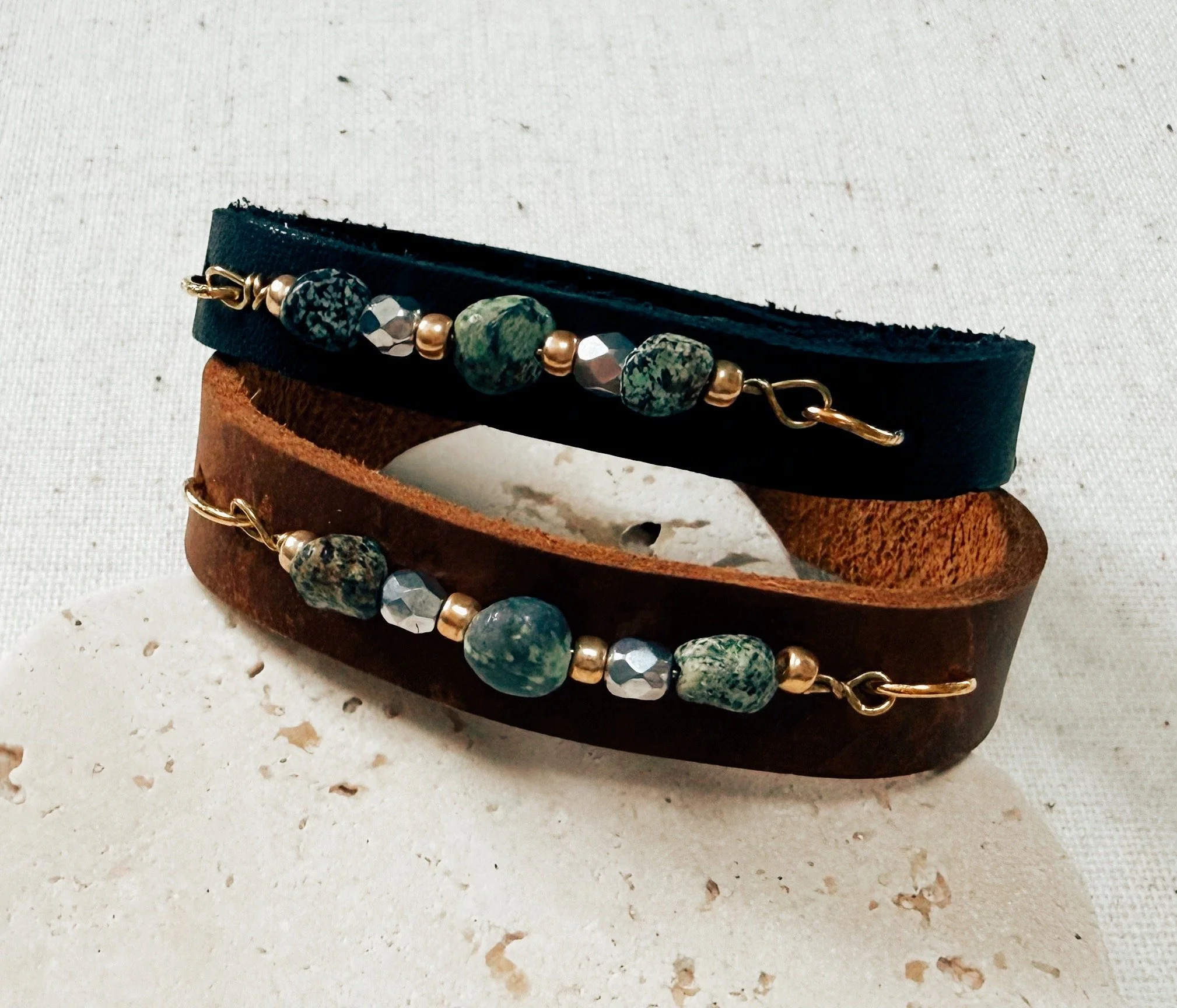 These cuffs come it 2 colors camel a black! Embellished with African turquoise stones, some gold fill and silver and gold seed beads. Bracelets measure 7in with 2 adjustable sizes.