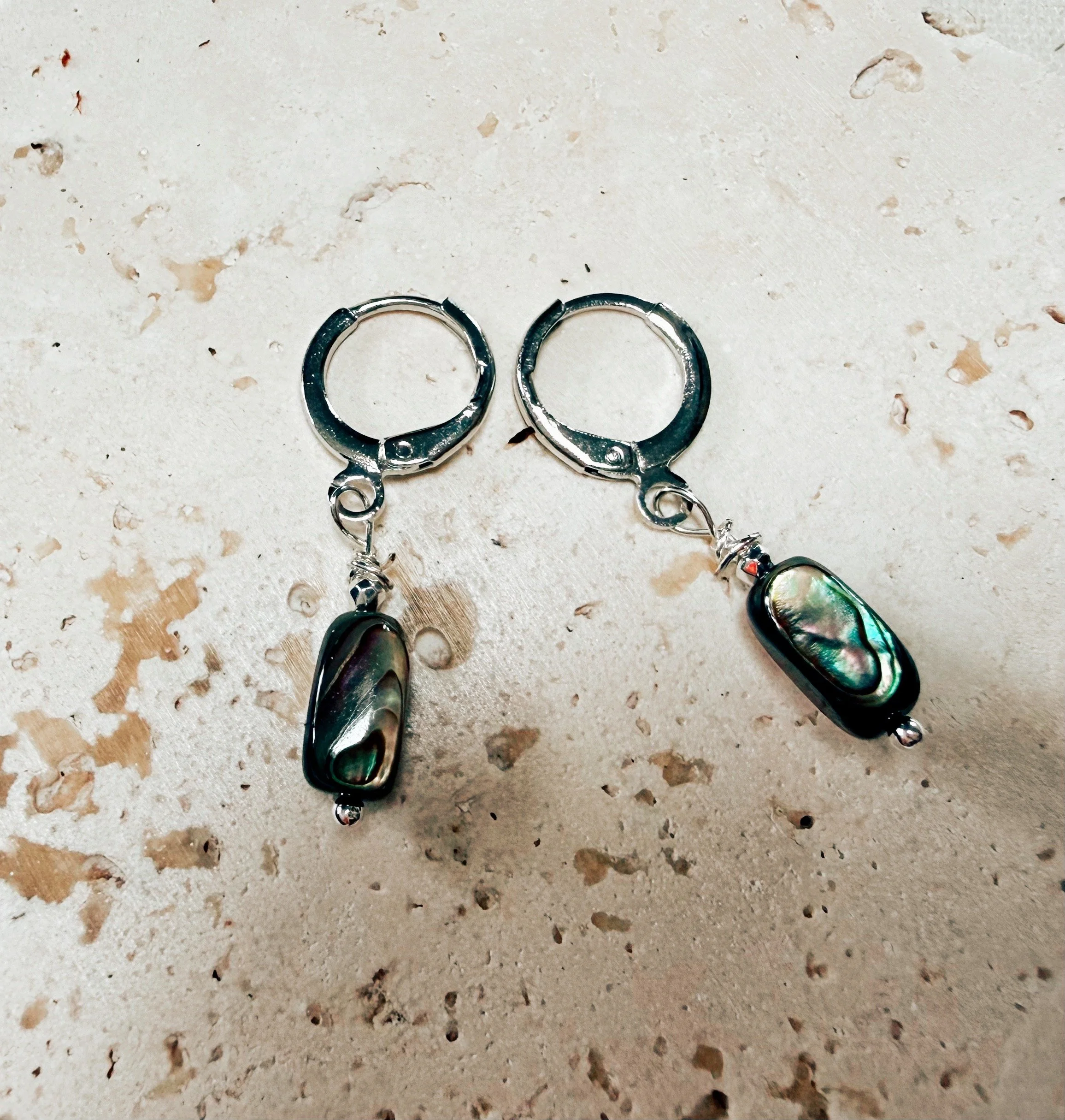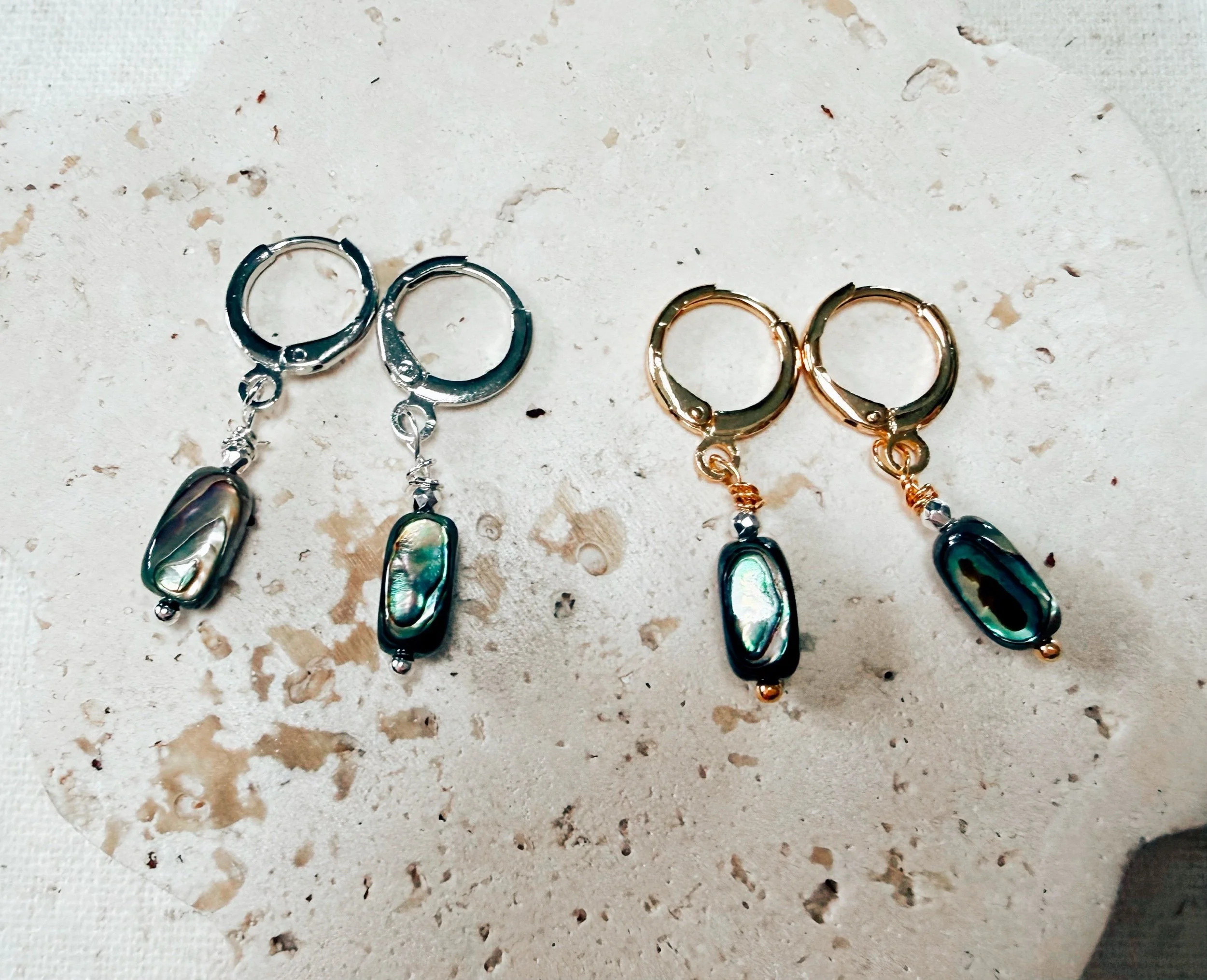 These delicate abalone shells have been tumbled so they’re extra smooth and accented with some gold fill and tiny titanium silver hematite bead and a gold plated hoop! Also available in silver plated.