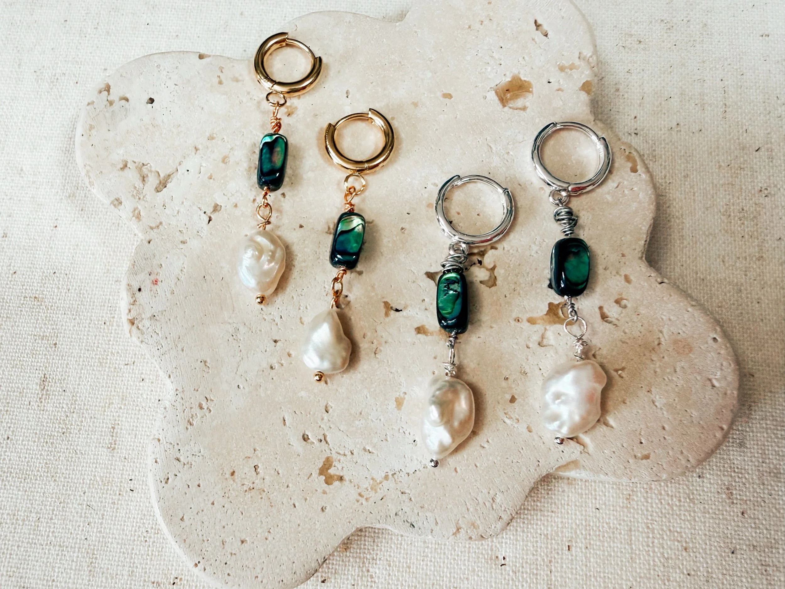 These might be my new favs! An abalone stone, some gold fill and a Keshi cultured freshwater pearl, all dangling from a dainty gold or plated huggie hoop. Also available in silver plated. It is so soft and delicate!